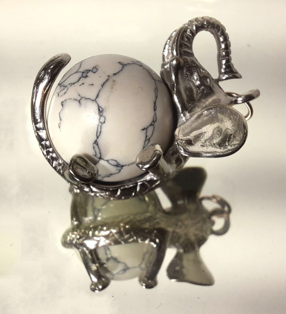 This beautiful piece of art showcases a howlite sphere in a pendant made to look like an elephant. Howlite, a borate mineral is distinctly white with thin grey to black veins. This "Stone of Serenity" gives calmness and reduces stress. and anger. Wearing the howlite pendant activates the crown chakra promoting clear communication and intuition. Elephant figure is believed to attract good luck, prosperity, protection and enhances wisdom, family unity, and strength.