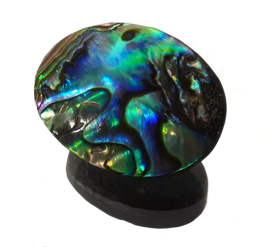 Abalone is a sea snail belonging to the genus Haliotis. Abalone shells are 20-200mm, characteristically flat, ear-shaped with nacreous interior and row of respiratory holes. The nacre is highly iridescent with strong colors making the shells valuable for jewelry making. Abalone shells are believed to promote emotional balance, reduce anxiety, and enhance intuition.