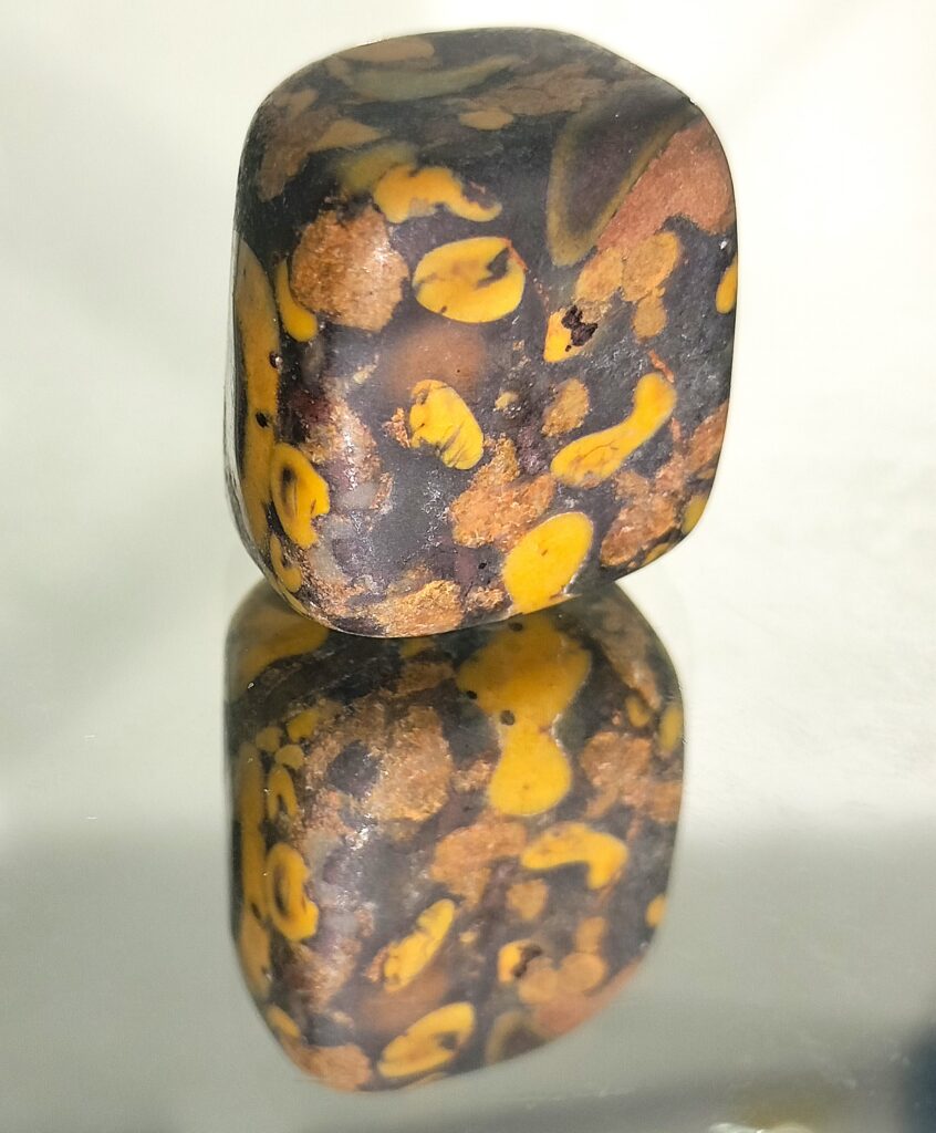 This tumble stone features a fruity marvel from the heart of India that adorns the majestic palaces. A conglomerate of fossilized jasper stones, it displays unique mosaic pattern in green, yellow, and brown colors resembling a fruitcake or some abstract artwork. Tumble stone can be carried along or it can be used for meditation. It can also be used in pendants and key-chains. Ajooba jasper offers supportive, nurturing energy to overcome fear and stress.