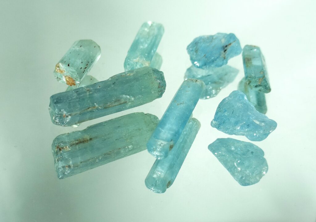 Aquamarine is a type of beryl with a pale-blue to light-green color and transparent to translucent prismatic hexagonal crystals. The color is due to presence of iron. Aquamarine can be found in Afghanistan, Pakistan, China, Kenya, Russia, USA, Brazil, Nigeria, Madagascar, Tanzania, Sri Lanka, India, and Australia. Due to its hardness of 7.5 to 8 on Mohs scale, it is suitable for use in jewelry. Aquamarine is known to promote inner peace, communication, decision-making, love and compassion. It is also associated with prosperity.