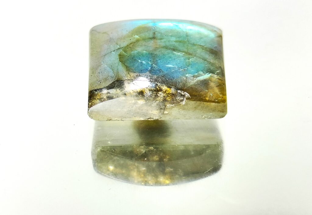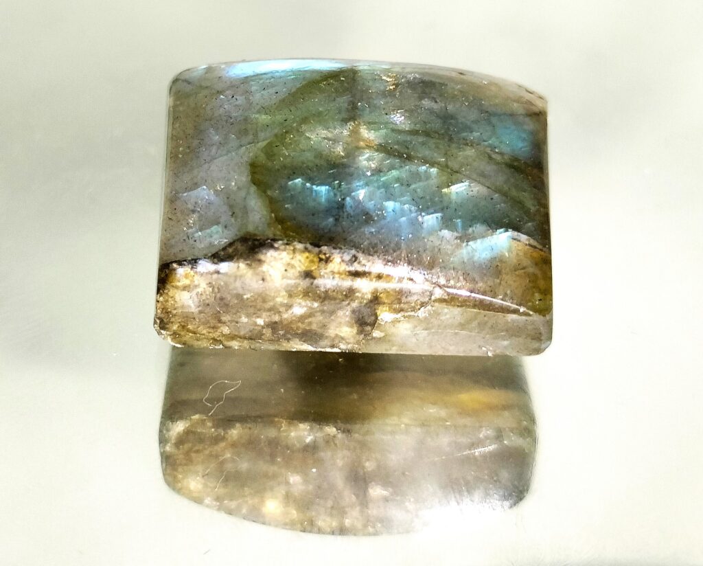 This rectangular cabochon of labradorite displays blue-green glow of light reflected from an array of innumerable crystal planes aligned in characteristic manner. Cabochon can be used in a ring, pendant or necklace. As a stone of transformation, it aids in progress, good fortune, creativity and personal evolution.
