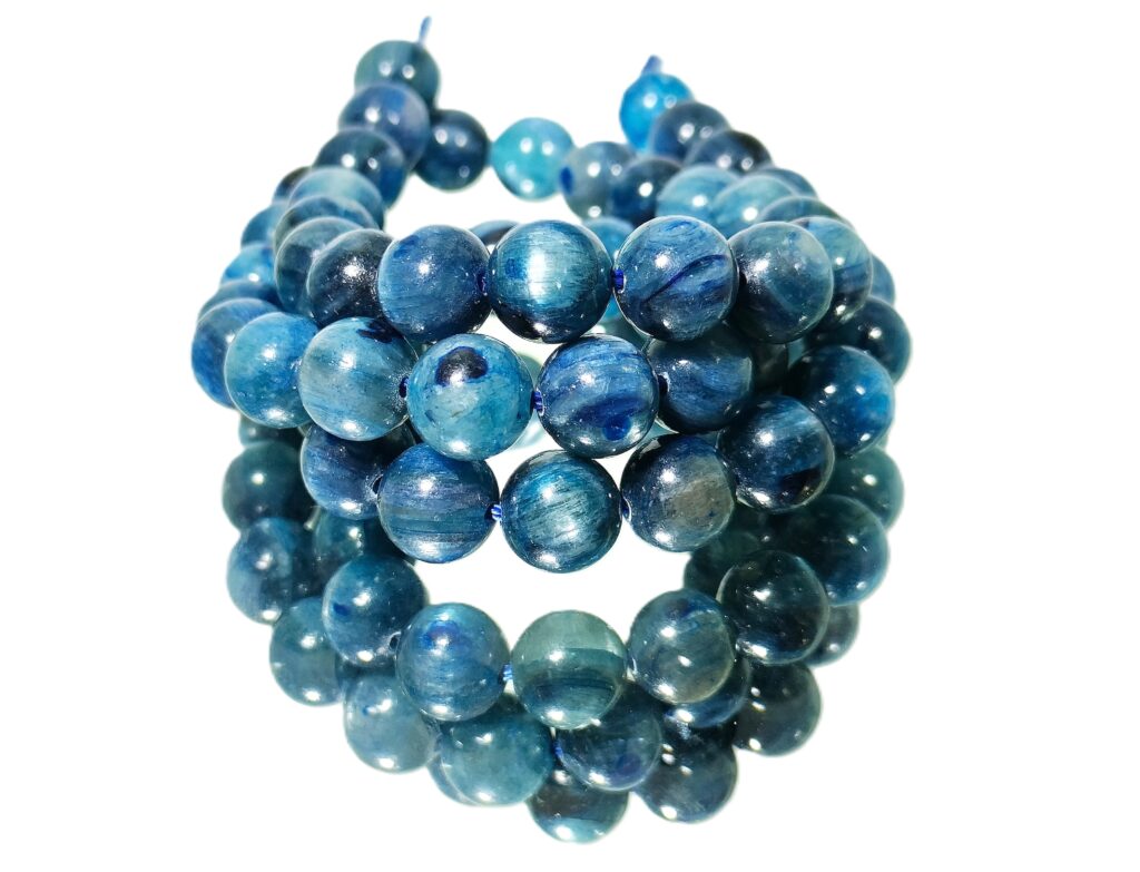 This necklace features the geometry of peace, etched in shades of ocean and ice! The 8mm beads of Blue Kyanite form a beautiful string that adds to the striking personality of the wearer. The parallel triclinic crystals cause an eye-catching cats-eye effect possible due to polishing of the beads. The pearly luster adds to the uniqueness of the jewelry. Blue kyanite is associated with throat chakra and third eye chakra and is believed to aid in communication.