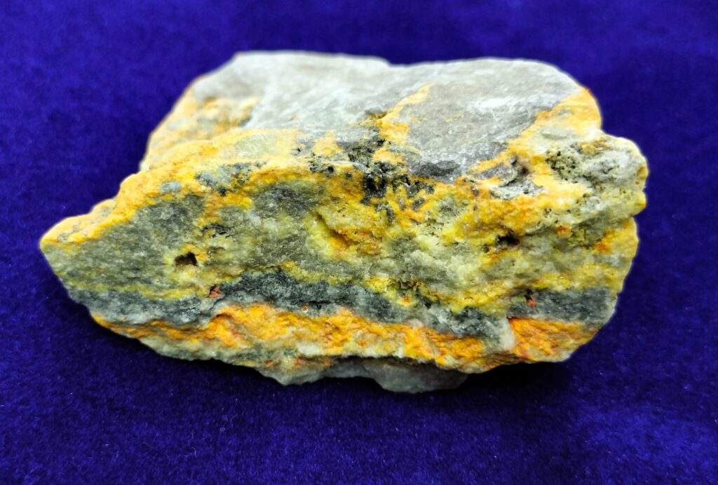 This raw Bumblebee Jasper or Sunset Jasper stone looks as if slices of sunset are trapped between layers of midnight ash. This pseudo-jasper stone is a rare non-silicate volcanic rock with characteristic yellow, orange, grey and black bands. The presence of arsenic sulfur minerals make the raw stone unsafe to handle with bare hands, although polished or sealed stones are safer. Bumblebee jasper is associated with the solar plexus chakra and sacral chakra and possesses energizing and uplifting properties. Raw stone with it's eye-catching patterns inspires new ideas and infuses joy. It can be kept for display to beautify the home or office.