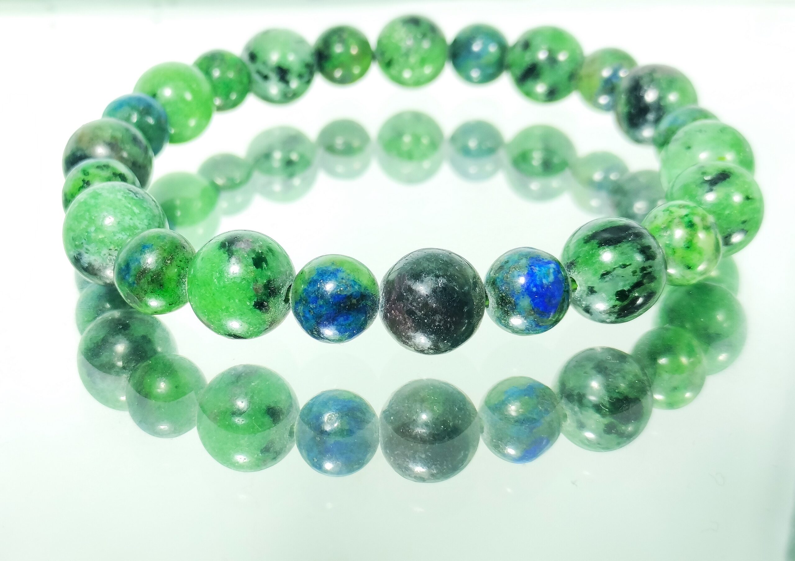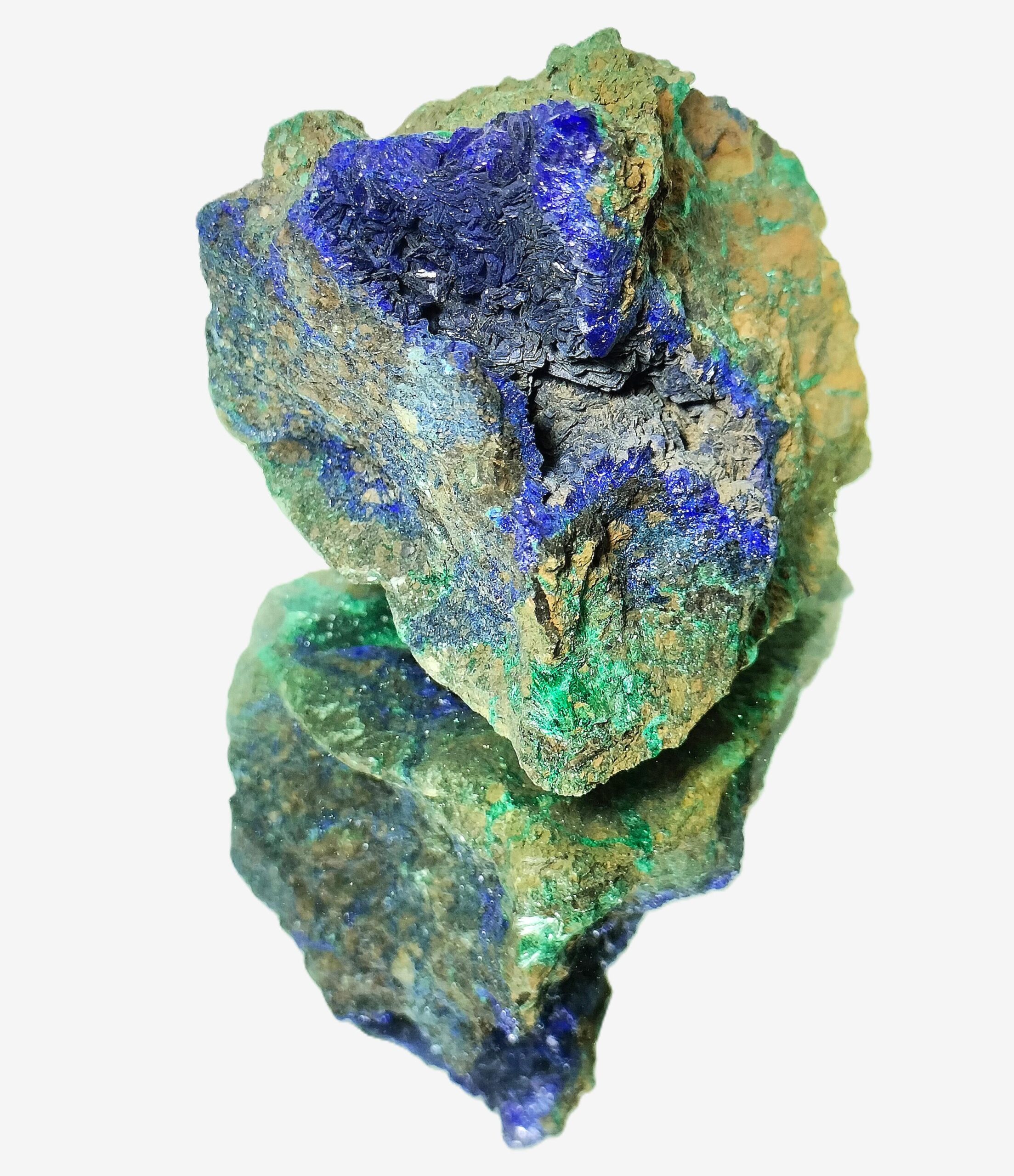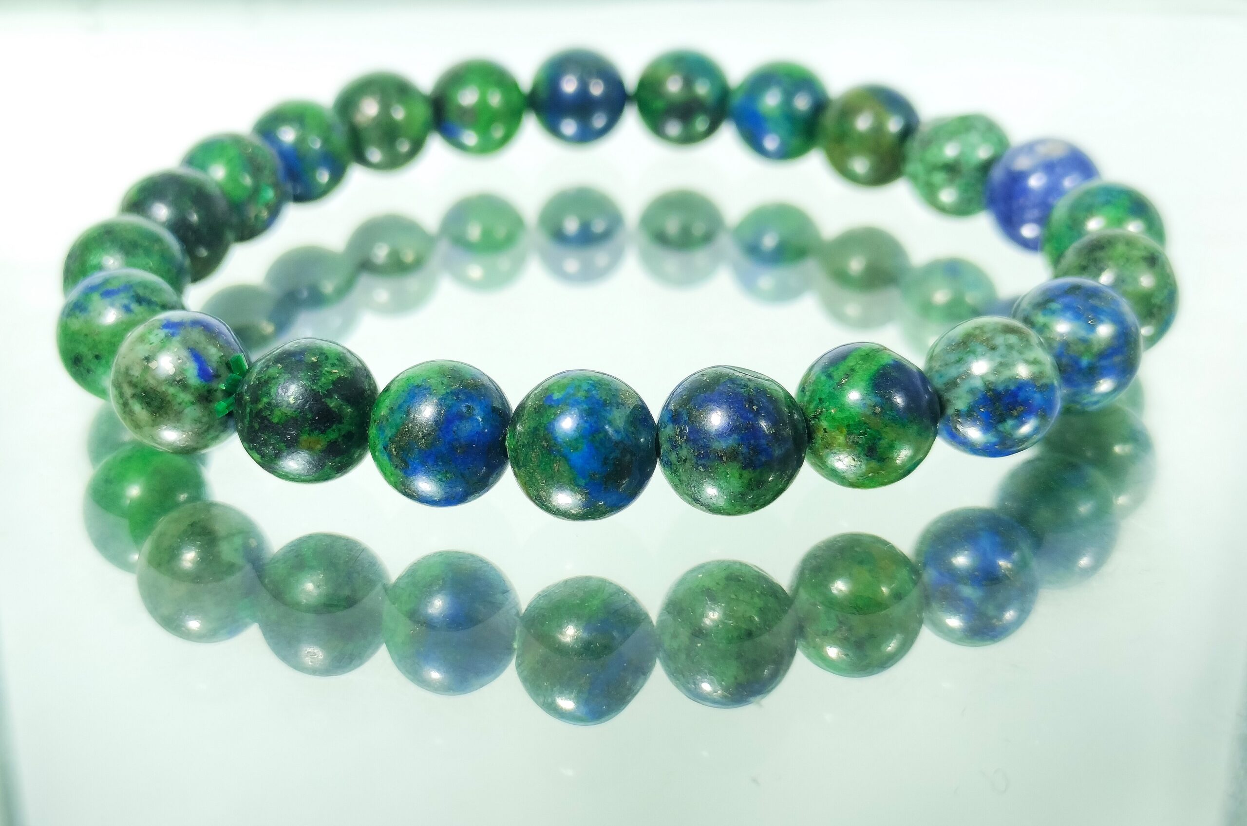Azurmalachite or Azurite-Malachite is a rare mixture of azurite and malachite with a distinctive mottled green and blue coloration. It is found above copper deposits in the United States, France, and Namibia. It is believed to harmonize the mind and heart, promoting clear communication and emotional stability.