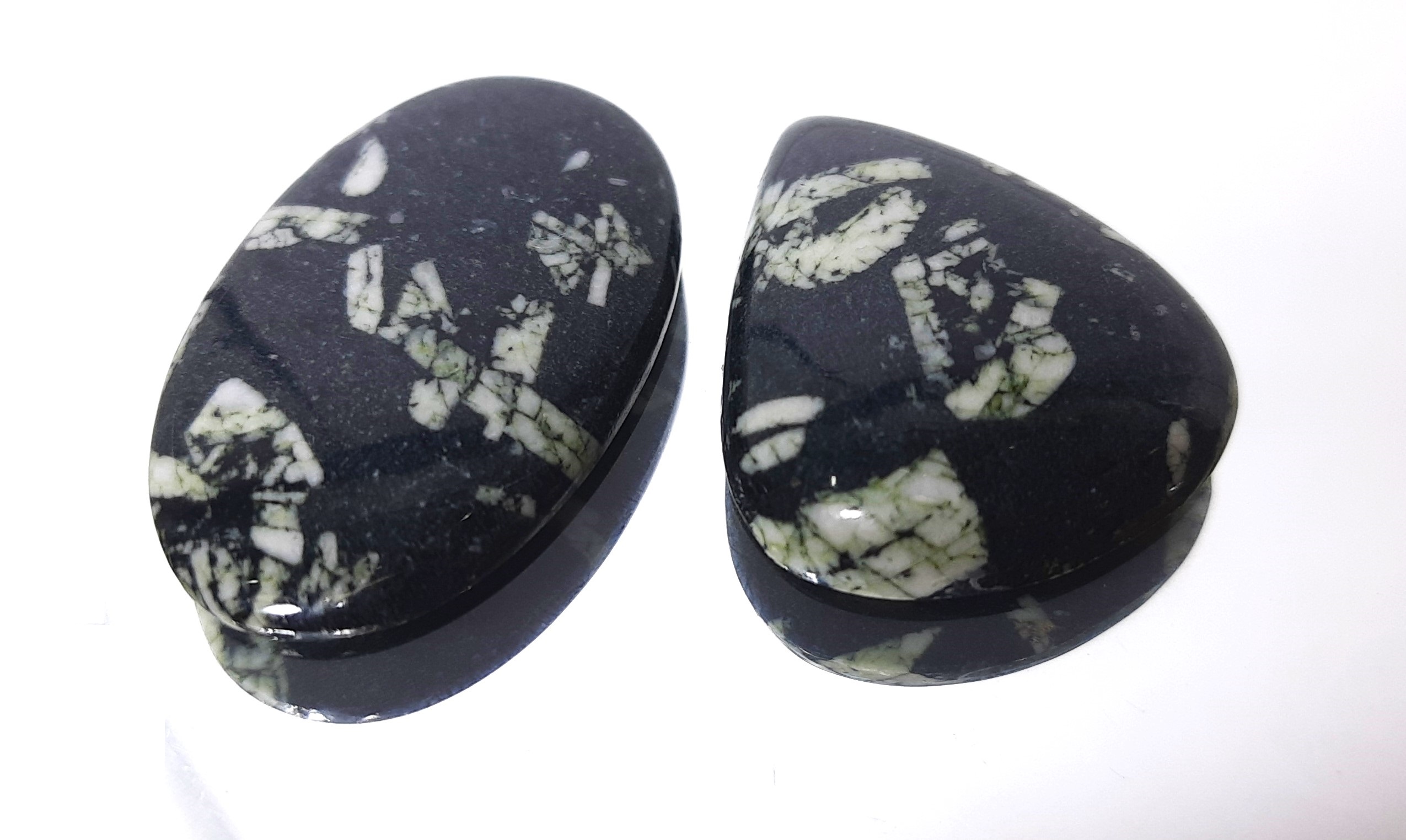 These necklaces feature interesting types of natural stone beads that carry message in Chinese script! The host stone is basalt with white or pale yellow rosettes of feldspar and is called Chinese writing jasper. The beads can be used to make necklaces or bracelets. Chinese writing jasper stone is believed to enhance communication and writing skills and to regain balance. According to feng shui, it is associated with the earth element and promotes grounding, stability, and prosperity. It aids in prioritizing work and realizing self-potential.