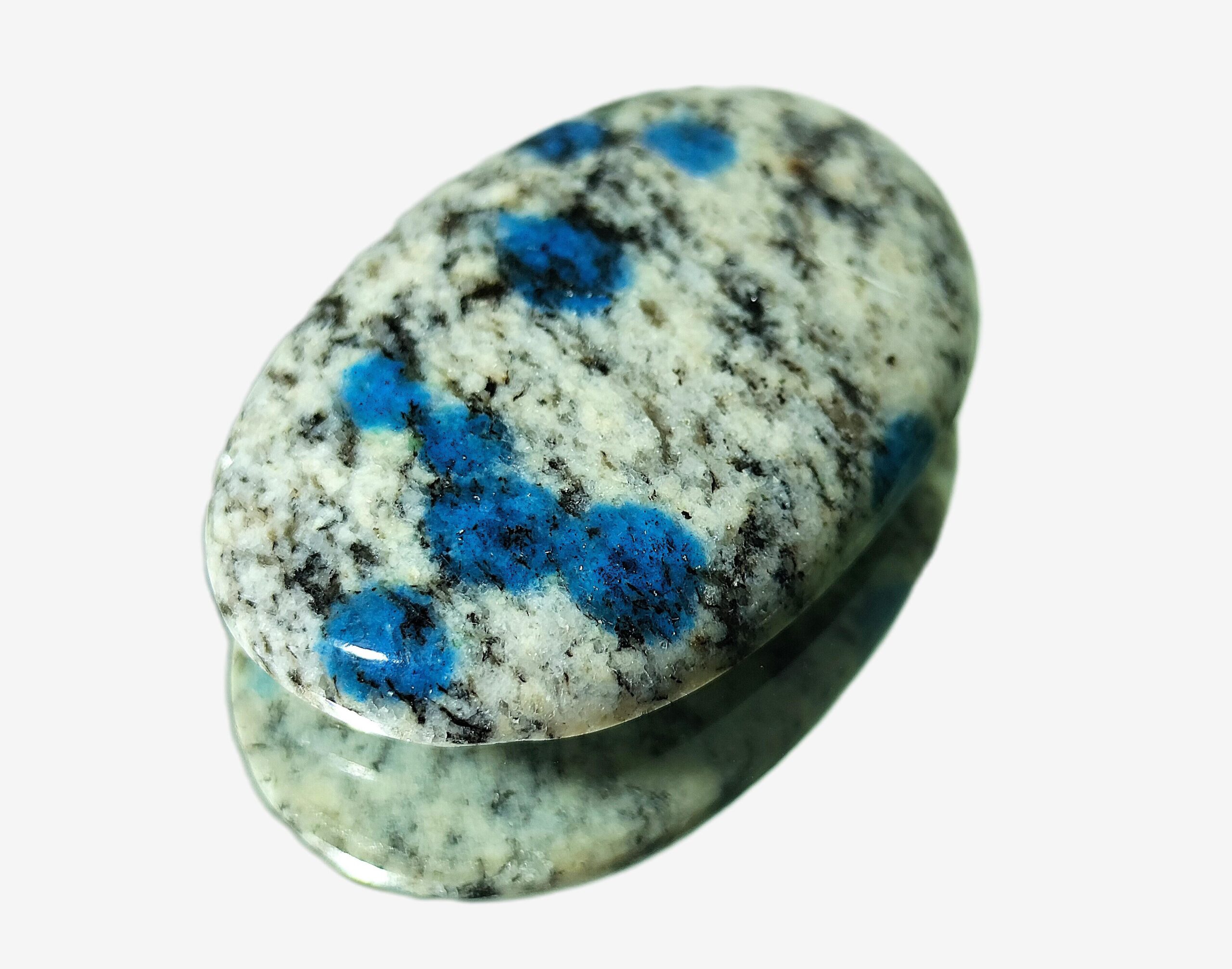 Blue ink spilled on a snowy mountain, that is how the raw K2 jasper appears! The white granite stone (not a jasper technically) hosts beautiful orbs of azurite. Due to the decorative appeal, it is used to make cabochons, palm stones, tumbles, towers, carvings and other products. Jewelry items such as rings, pendants, necklaces and bracelets are in good demand worldwide. K2 Jasper is believed to enhance spiritual insight and intuition, balance emotions, alleviate stress and promote inner peace, while granite is believed to aid in grounding. It is associated with the third eye chakra, aiding in communication and self-expression.