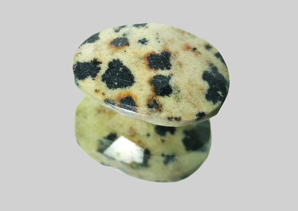 This striking cabochon of Dalmatian jasper can be used in rings or pendants. It displays numerous black spots on a cream-white background. It is well known as the “Stone of joy”, and brings happiness and laughter. It brings in energy and makes the body feel stronger and active. It is also known to offer protection, remove anger, sadness and fear. As a lucky stone, it brings new opportunities and success.