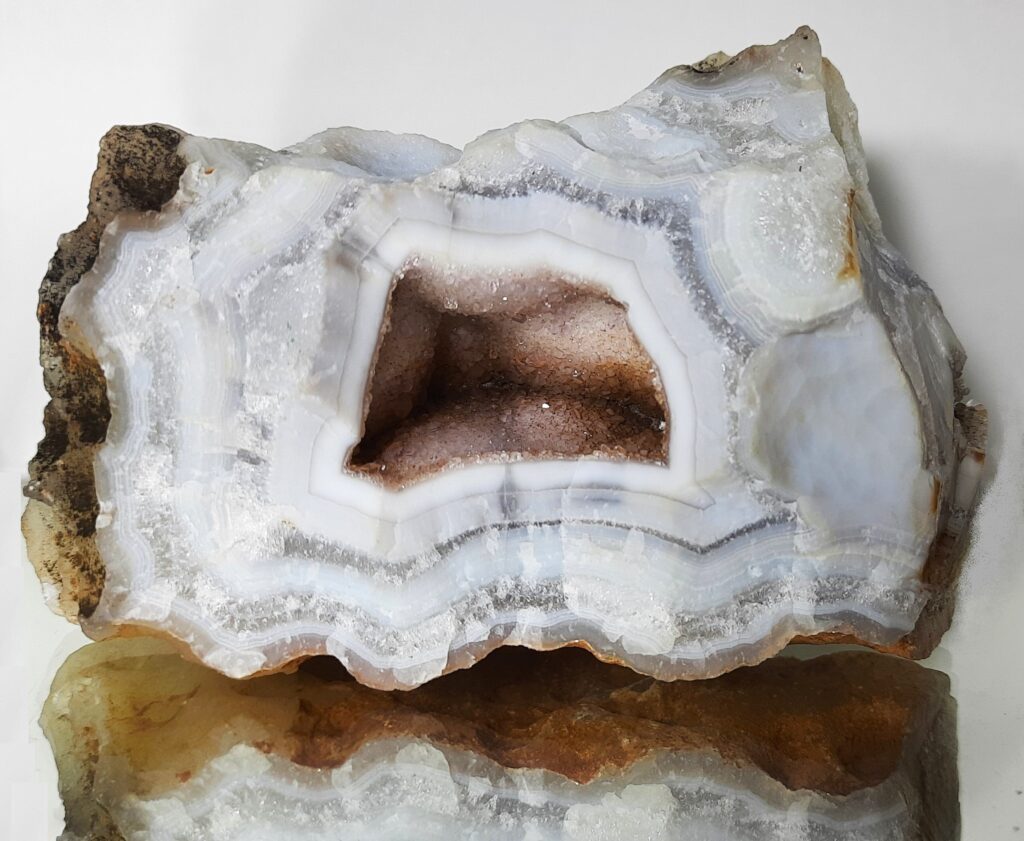 Druzy pertains to tiny glittering crystals forming inner layer of geodes or outer surface of a rock or mineral. This beautiful geode has concentric bands of agate enveloping shimmering tiny crystals. Druzy has various forms that display characteristics of different minerals they are composed of, viz. quartz, calcite, chalcedony, malachite, azurite, pyrite, garnet, hematite, cobalt calcite, etc., resulting in unique colors and textures. Druzy agate geode believed to be associated with peace, love, intuition, stress-relief, and inner strength. It is also known to promote emotional healing.