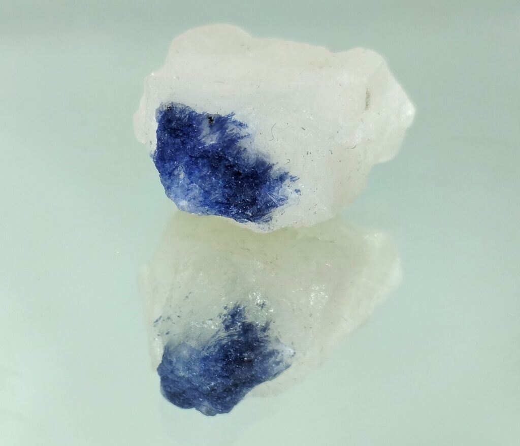 Raw dumortierite appears as beautiful blue fibrous inclusions in quartz crystals as in this image. The crystals are orthorhombic with vitreous luster. In the native raw form, it has intense energy that is useful for meditation and healing. Raw dumortierite is a unique display item to decorate any place. Popularly known as the “Stone of Patience,” it enhances focus, mental clarity, enhance focus, and peace of mind.