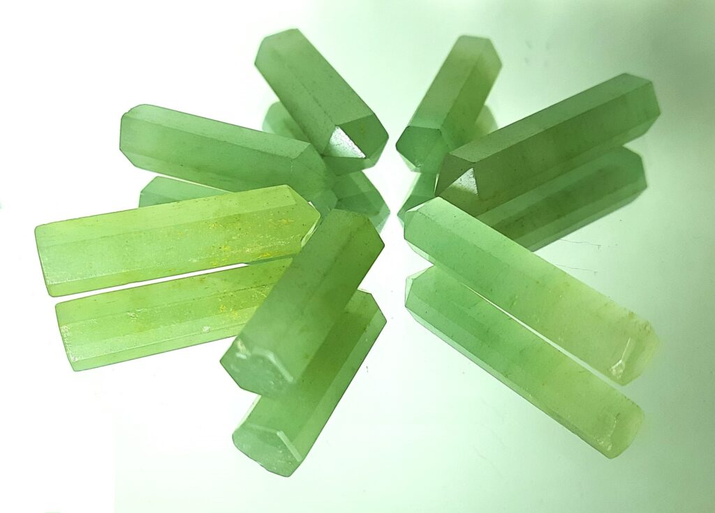Aventurine, a type of quartzite is a translucent stone that displays characteristic metallic glitter called aventurescence (shimmering or glistening) due to mineral platelets (mica) oriented within the stone. The color varies from green to orange, brown, yellow, blue, or grey. Green and blue-green aventurine is found in India while other types are found in Chile, Spain and Russia. The stone is carved into beads and figurines, while fine quality material is carved into cabochons. Green aventurine brings about emotional healing, lets go of bad memories and promotes inner harmony. It also promotes love, compassion, and forgiveness, and thereby enhances relationships. Yellow aventurine is believed to boost confidence, creativity, and optimism. It is also known to promote prosperity and calmness.