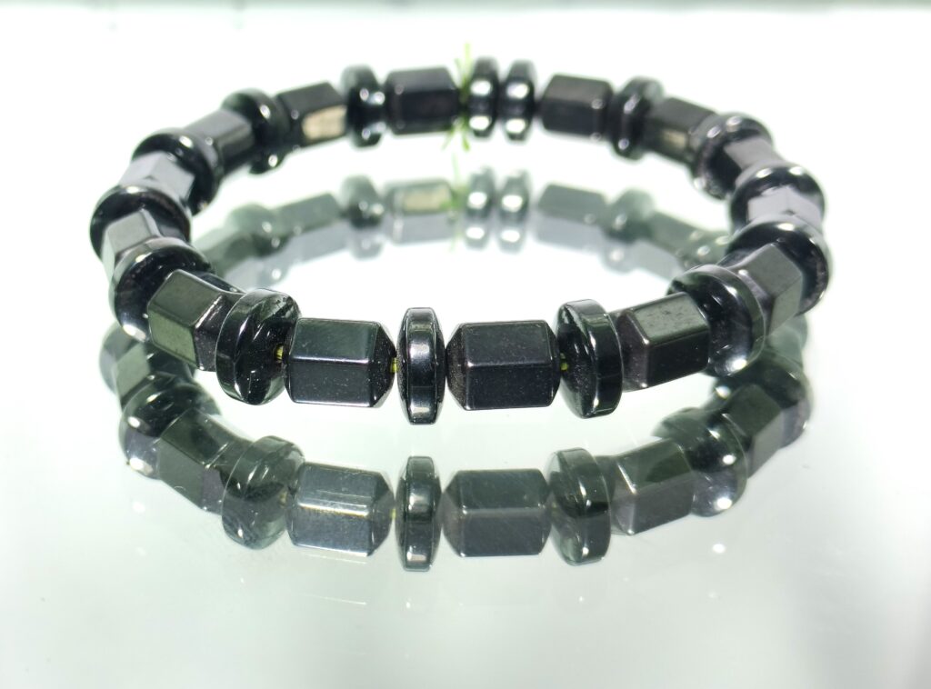 This hematite bracelet is made from pyramidal and discoid beads to give a stunning and elegant appearance. The characteristic metallic steel-like luster and gray color make it a vibrant piece of jewelry. Hematite is known as the “Stone of Protection” and is believed to offer calmness and stability to the wearer due to its grounding properties. Linked to the root chakra, it works as a protective shield for the wearer.