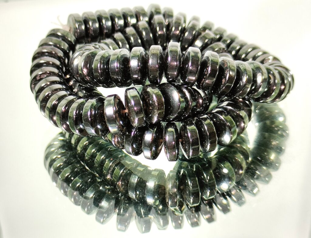 This hematite necklace features beautiful flat beads shaped like small discs. It displays characteristic metallic luster with a steel-gray color. The discs can also be used to make bracelets. Hematite is known as the “Stone of Protection” and is believed to offer calmness and stability to the wearer due to its grounding properties. Linked to the root chakra, it works as a protective shield.