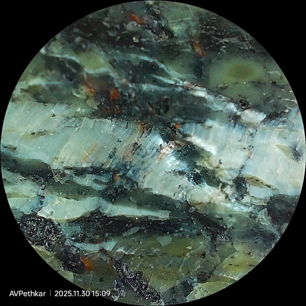 This microscopic view reveals the green band in Green Zebra Jasper. The distinct red colored spots are due to presence of hematite. Various other visible inclusions of iron and other minerals result in the green colored band. Parallelly aligned white crystals are microcrystalline quartz that gives a silky appearance to the stone.