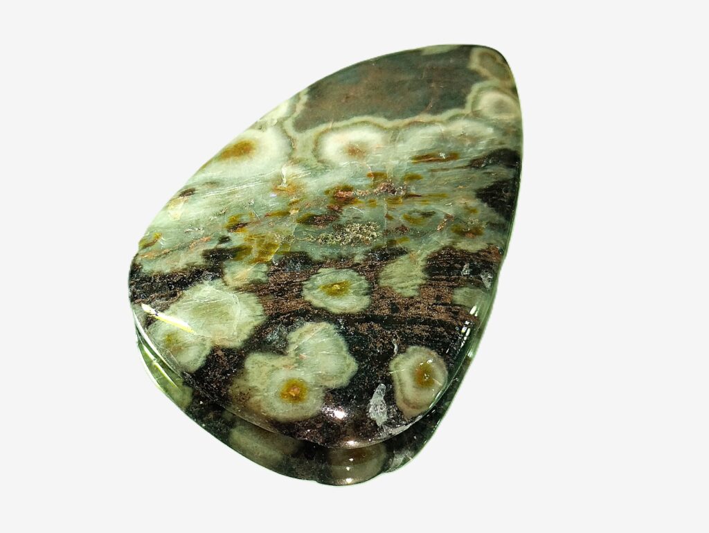 This orbicular jasper cabochon flaunts numerous white orbs with yellow centers resembling tiny white flowers on a glistening brown and black matrix. Radial aggregates of needle-like quartz and feldspar crystals are visible. As the stone of joy, ocean jasper cabochons offer joy, peace, emotional healing, relaxation and grounding. Drop shaped cabochons can be used in pendants and necklaces.