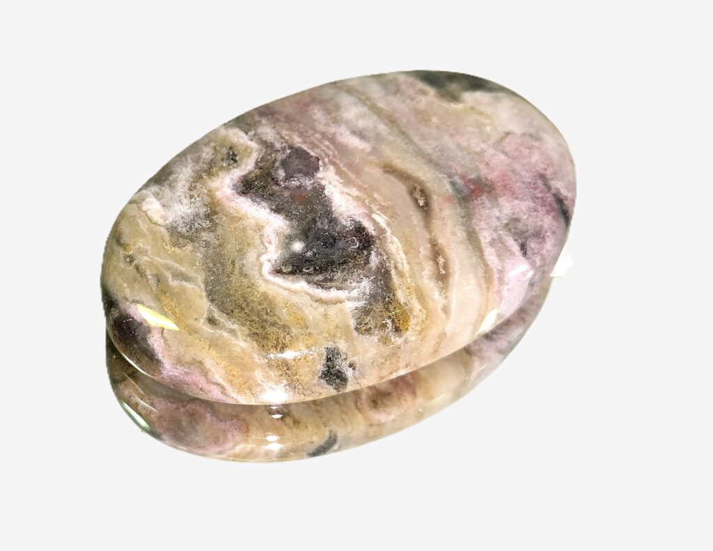 This eye-catching variety of Ocean jasper shows a swirling pattern reminiscent of angry waves of an ocean. Pink hues remind us of early morning glory. Cream and brown colors signify grounding energy. Ocean jasper cabochons offer joy, peace, emotional healing, relaxation and grounding. This unusual shaped cabochon can be used in pendants. Ocean jasper is believed to offer bring joy, peace, emotional healing and relaxation. It also encourages self-love and compassion. Due to it’s high polish, it is used as a decorative stone and as a gemstone.