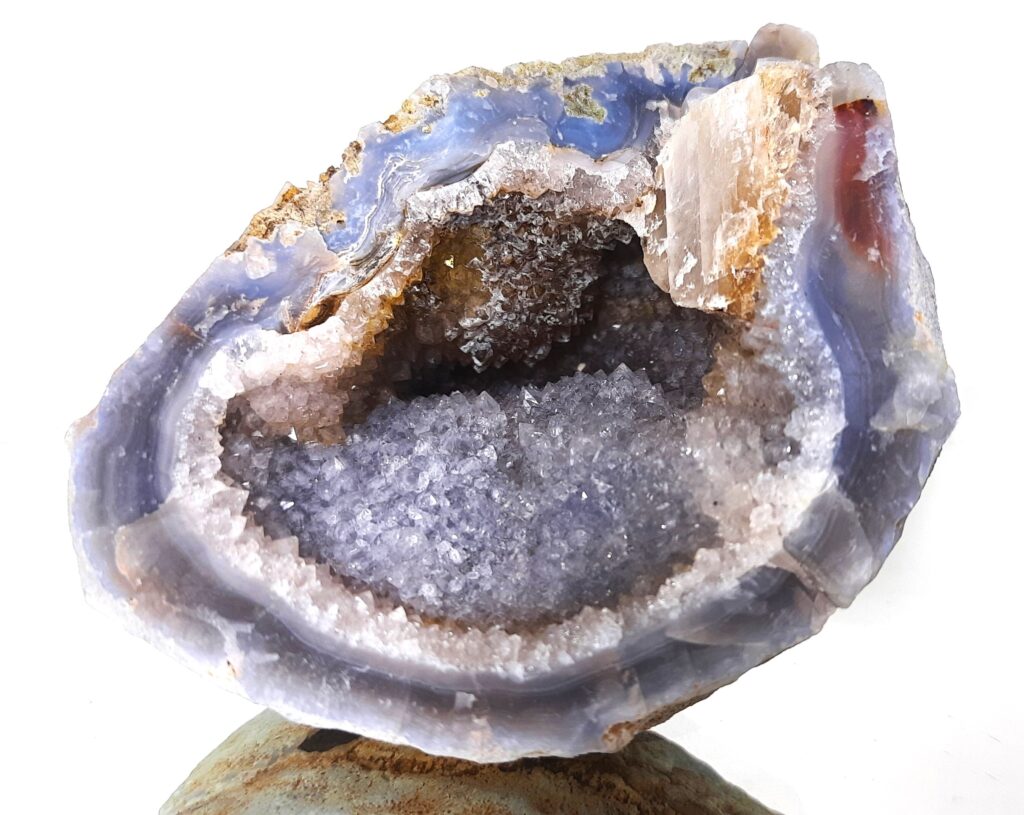 This nature's marvel showcases glittering clear quartz and smoky quartz crystals within concentric layers of agate. Clear quartz crystals amplify energy and clear the mind, while smoky quartz provides grounding, protection and freedom from negative energy. Smoky quartz is also believed to calm the mind and provide stability. Agate provides additional grounding and stabilization for emotional balance and managing mood shifts.