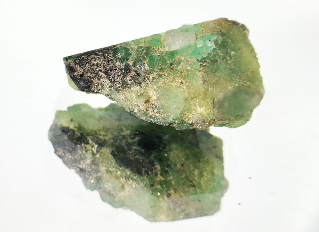 Raw emerald stone may display such beautiful crystallites if observed carefully. Large crystals of the beryl mineral are cut, and polished to beautiful precious gemstones. The hardness of emerald is suitable for use in jewelry. It is used in rings, pendants, necklaces and other customized pieces of art. Emerald crystals are hexagonal and prismatic and have numerous inclusions and surface-breaking fissures. Emerald is associated with the planet Mercury and linked to intellect, communication, and business. It is believed to cures epilepsy and leprosy; strengthens eyesight and memory.